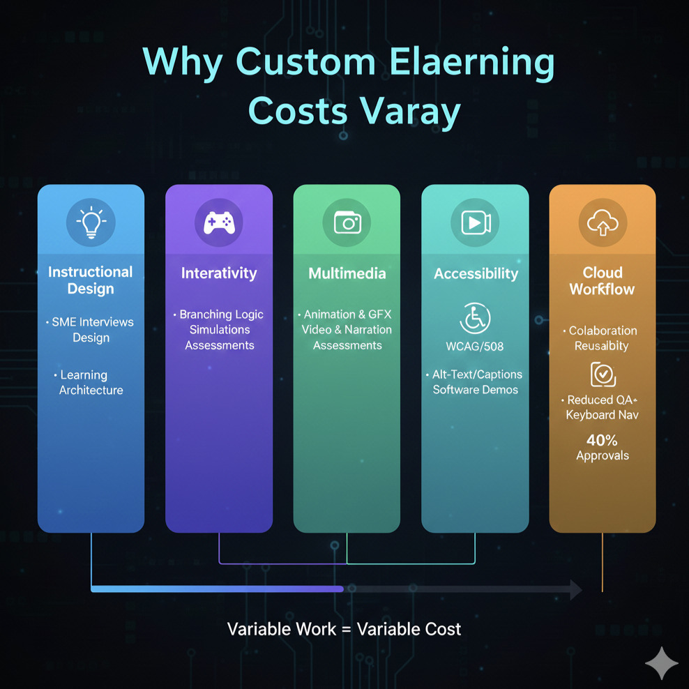 - “What actually drives the cost of interactivity, animation, SME time, accessibility, and cloud workflows?”
