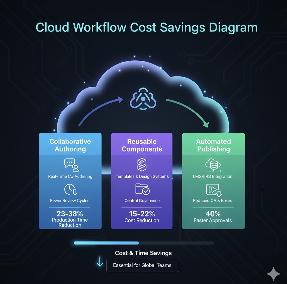 Modern teams now use cloud authoring platforms, reusable design systems, automated publishing pipelines, accessibility-by-design templates, and real-time SME collaboration.