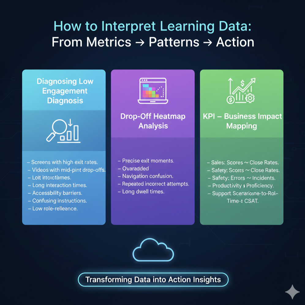 For example, if 90% of learners drop off at the same slide, the issue isn’t the learner, it’s the design.