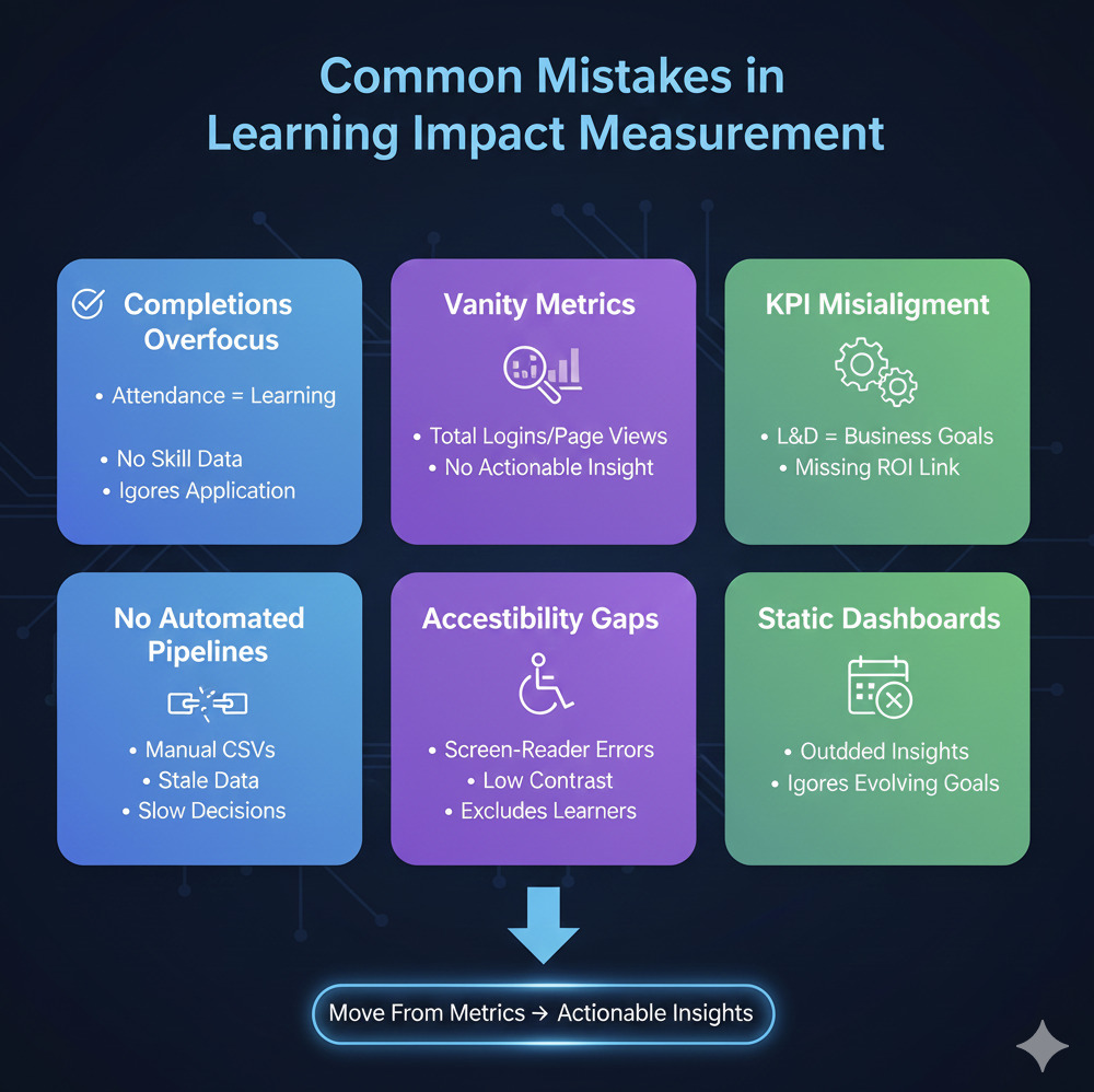 This is why modern dashboards map completions → assessment delta → performance KPIs to show real progress.